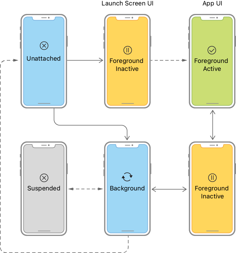 예를 들어, 시스템은 위치 이벤트를 처리하기 위해 `background`에서 Scene을 실행할 수 있다. 사용자가 App의 UI를 닫으면 UIKit은 `background` 상태로 이동하고 결국 `suspend` 상태로 이동하게 된다. UIKit은 언제든지 `background` 상태나 `suspend` 상태의 연결을 끊고 리소스를 회수하여 해당 scene을 `unattached` 상태로 돌릴 수 있다.