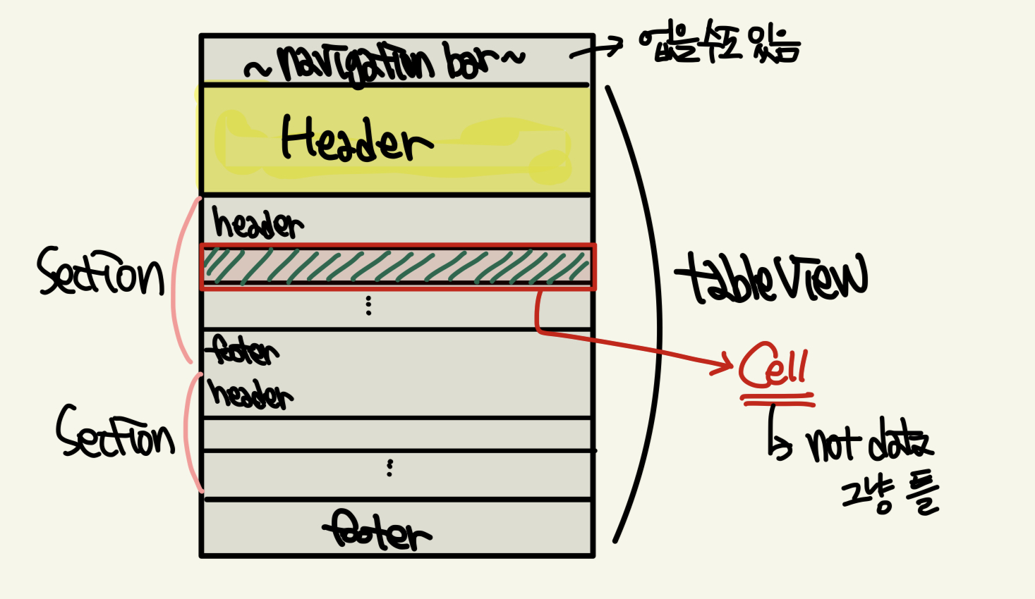 - header, row(cell), footer가 하나의 section으로 묶이며, Section / Row 모두 index로 접근이 가능하다.